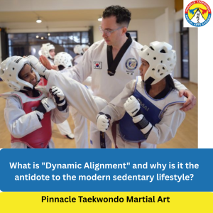 The Solution: Kinetic Chain Activation Taekwondo is built on the foundation of a strong, upright spine. At Pinnacle, our training emphasizes Dynamic Alignment. Every kick requires you to engage your deep core and open your hips, actively reversing the “crunched” position of office work. We focus on the Kinetic Chain, ensuring your body moves as a unified, powerful system rather than a collection of stiff, isolated parts.
